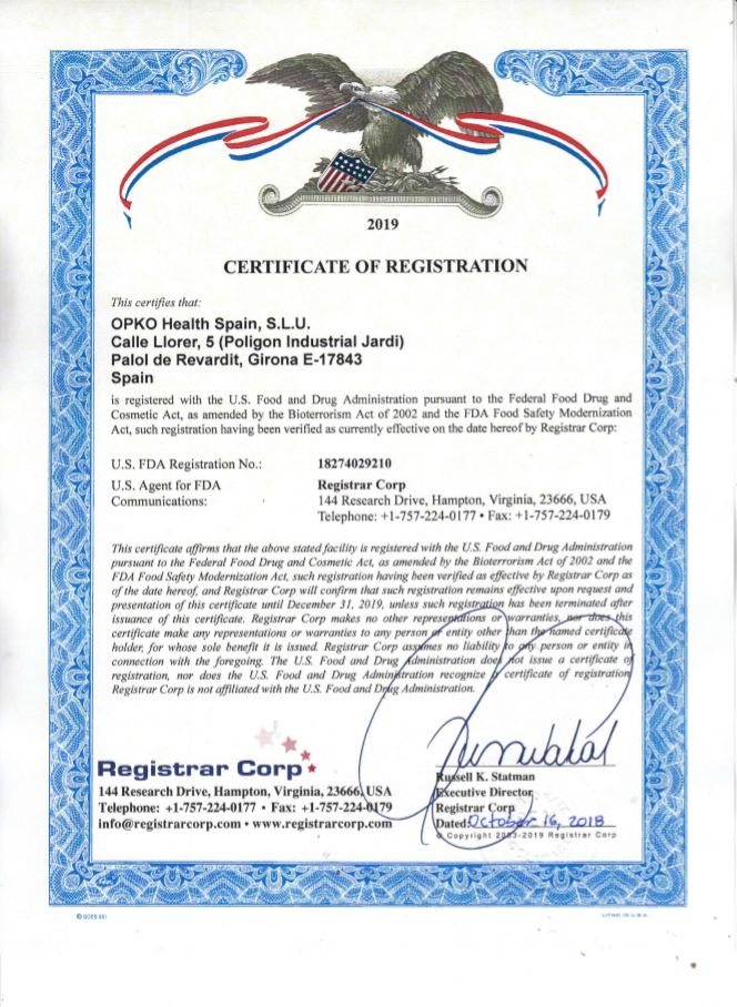 Por último estamos registrados en el Registrar Corp de la FDA como productores de complementos de productos dietéticos.