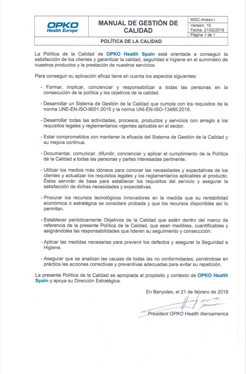 La Política de la Calidad de OPKO Health Spain está orientada a conseguir la satisfacción de los clientes y garantizar la calidad, seguridad e higiene en el suministro de nuestros productos y la presentación de nuestros servicios.