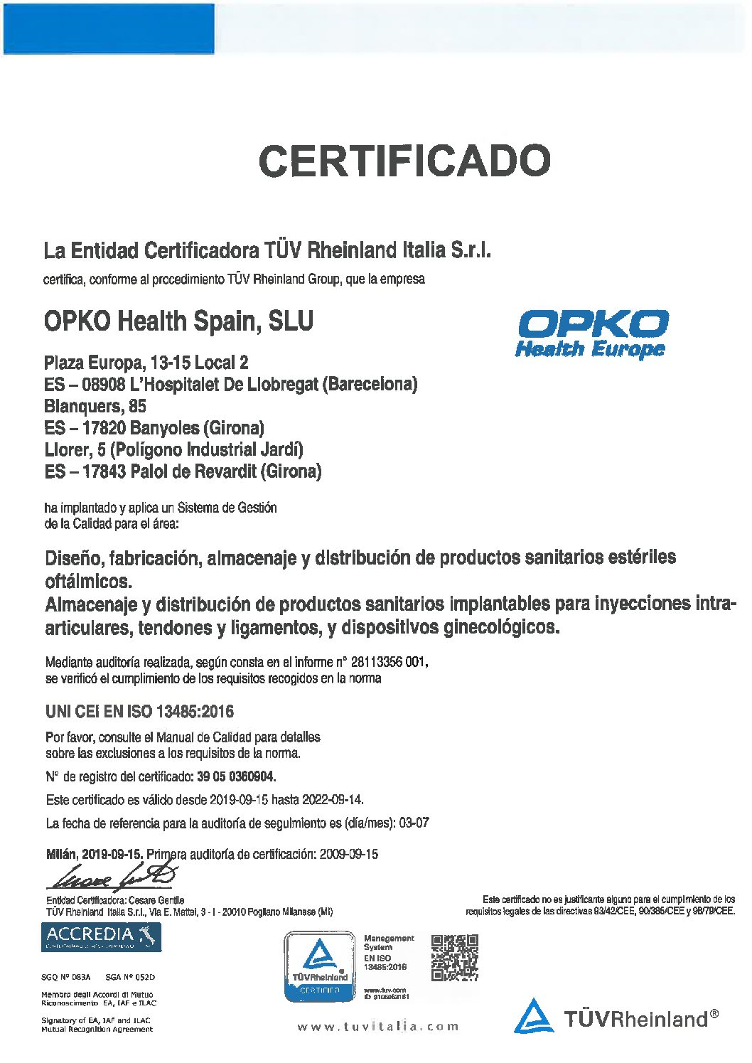 También disponemos de la certificación ISO 13485:2016 de Productos Sanitarios.