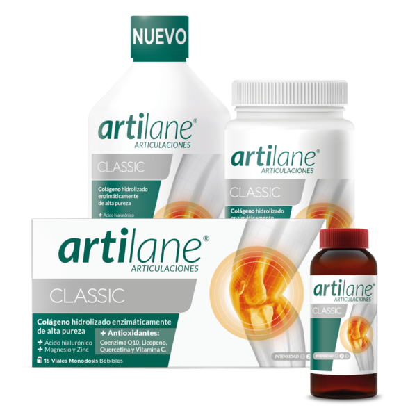 Artilane® Classic a base de colágeno hidrolizado enzimáticamente de alta pureza, Ácido hialurónico, Magnesio, Zinc y antioxidantes como Coenzima Q10, Licopeno, Quercetina y Vitamina C.